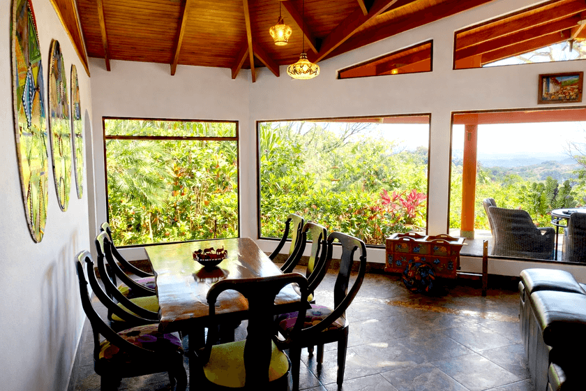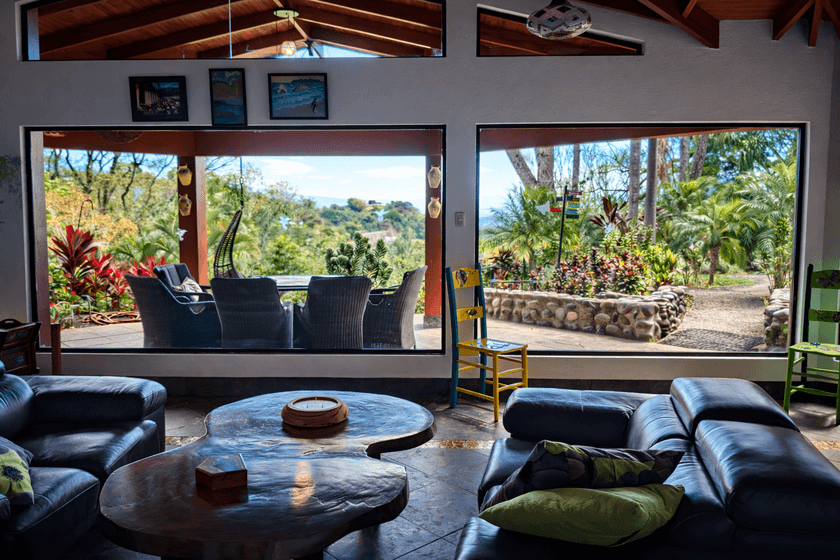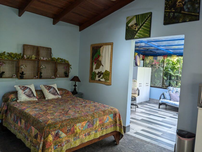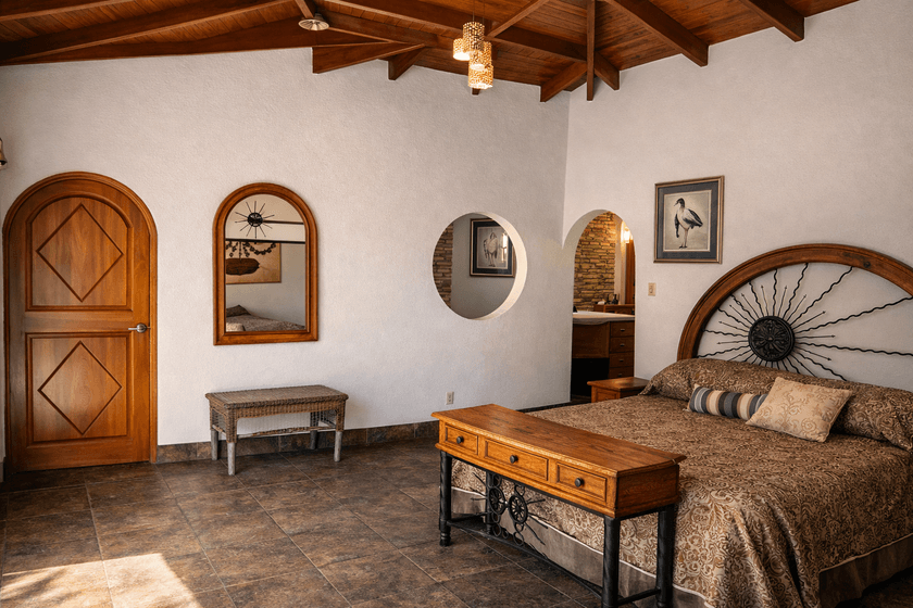 La habitación principal es un refugio de confort y encanto natural. Sus amplios ventanales enmarcan la diversidad de colores del jardín y permiten que la brisa fresca mantenga el ambiente siempre ventilado y agradable.