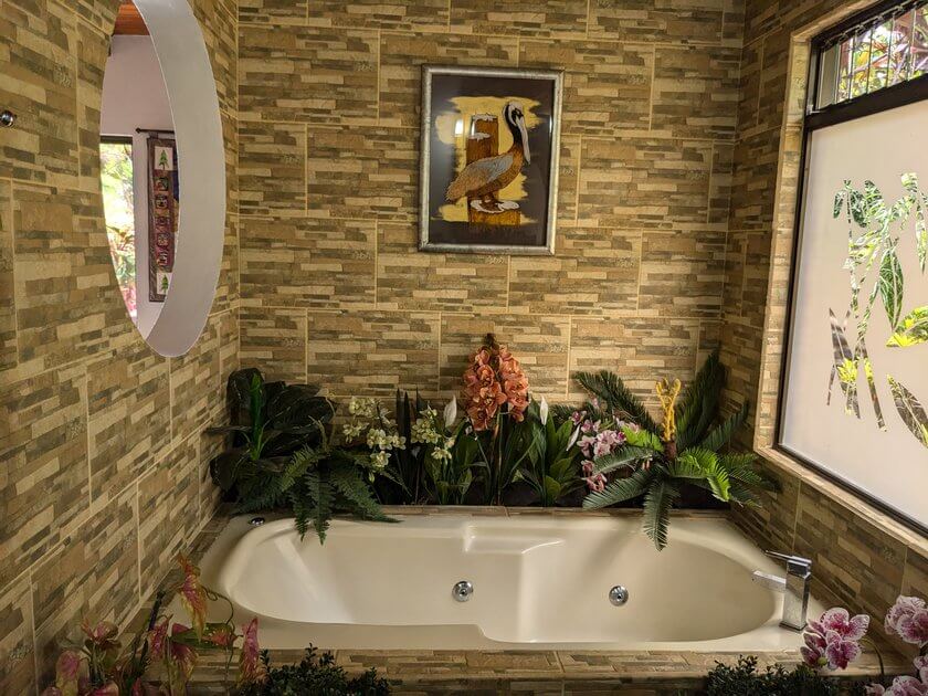 El baño en suite es una verdadera joya: cuenta con una bañera de hidromasaje perfecta para relajarse, una ducha rodeada de vegetación y un amplio vestidor que ofrece comodidad y estilo.